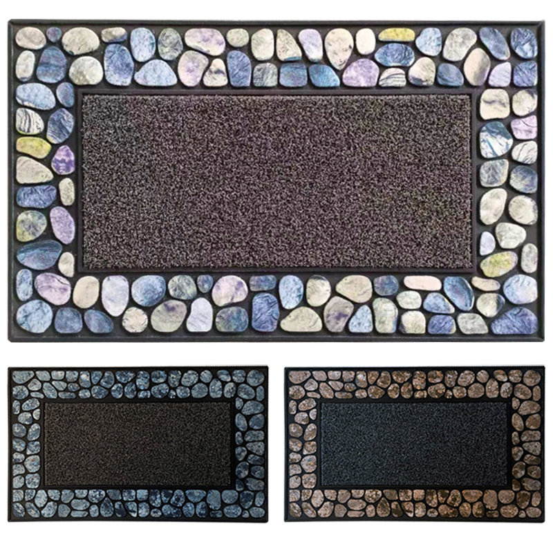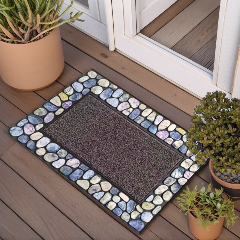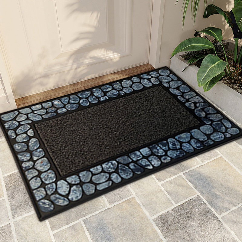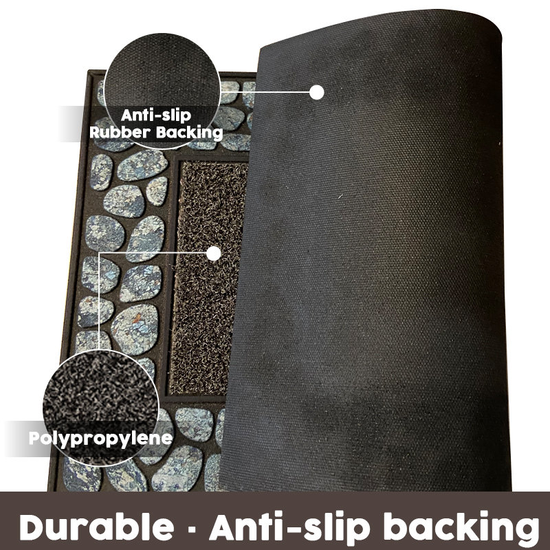 This versatile mat, with its classic and elegant Pebble Stone Pattern border, brings natural aesthetics to any entrance space. The surface of the pebble stone pattern is further enhanced by a precise electrostatic flocking process, lending it a unique three-dimensional feel and a refined tactile quality. The mat’s central area features an efficient Polypropylene (PP) faux grass surface, effectively scraping off dirt and dust to keep interiors tidy. The bottom is composed of sturdy granulated rubber, providing excellent anti-slip performance and stability.